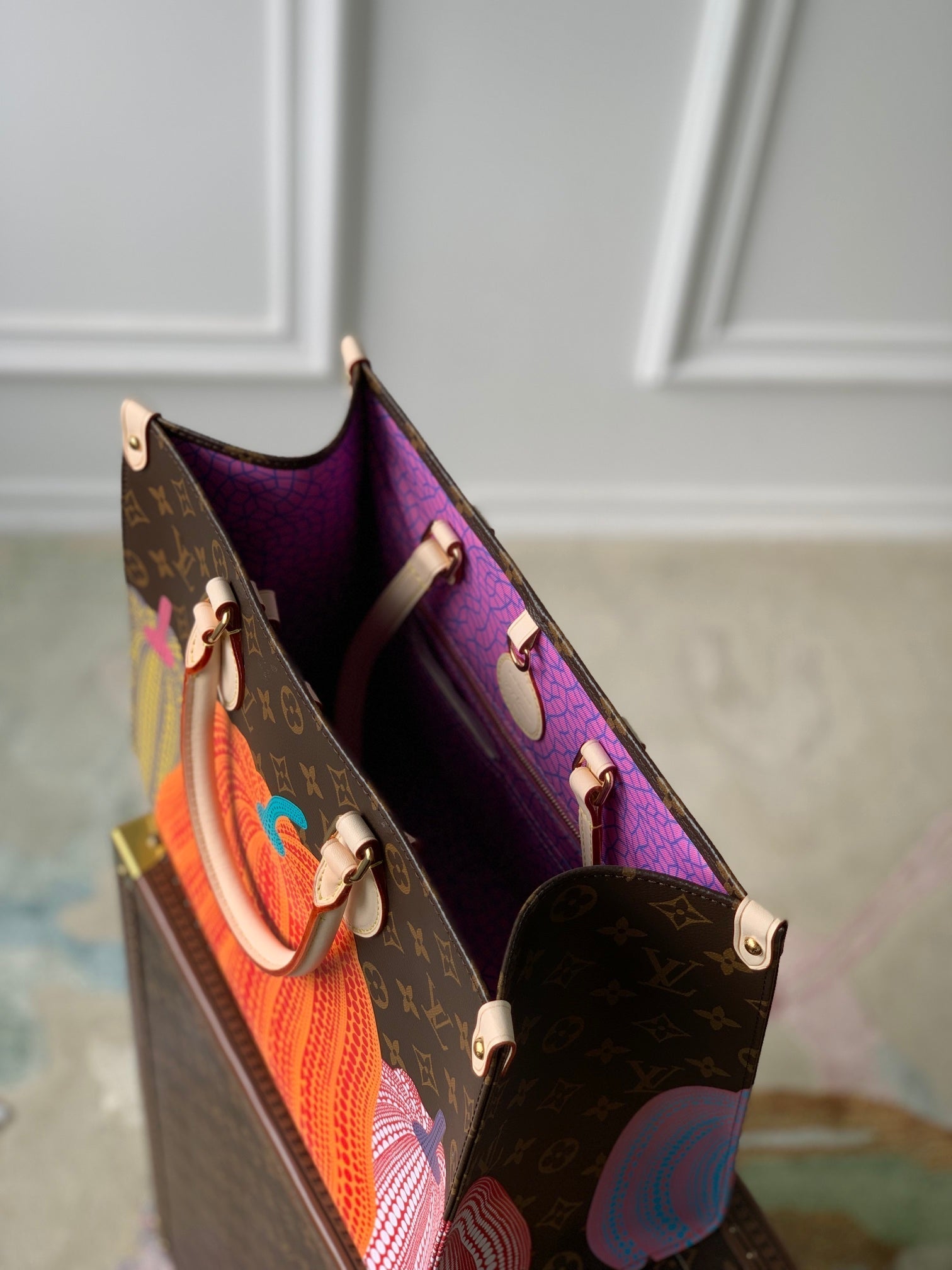 LV x YK ONTHEGO 35 IN BROWN MONOGRAM COATED CANVAS AND CALFSKIN PUMPKIN PATTERN